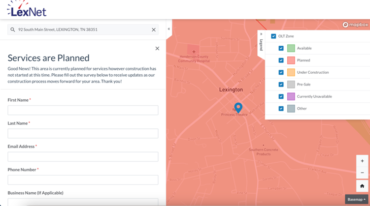 From here, navigate to the search bar on the left side of the page, key in your home or business address, and hit enter. A form will appear that tells you the status of fiber internet in your area. If your location falls in the "Under Construction" or “Planned for Service” categories, don't worry! This means we’re making progress to bring LexNet to your home or business. Please be patient as we build out this extensive fiber network; it takes time to do it right.